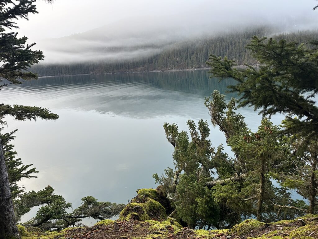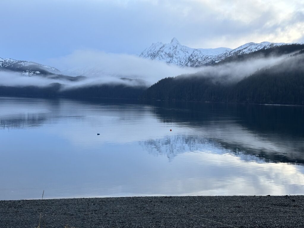 The December air warmly kissed my face as I walk down the hill from the cabin, towards the beach to the trail to the point where we can make phone calls. The snowless coastline was loosely cloaked in gracefully woven breathless clouds. These traveled up to gently hug not only the spruce forests, but the jagged mountain peaks as well. The only sound in the still air were the bald eagles talking, squeaking back and forth about only the imaginable. One came swooping over, flying over the beach towards the mossy forest path I would soon be walking. As I climb the small hill to the trail, I hear the seals longingly growling on a rock haul out they frequent near the cabin. I look down to check over the first exposed cliff to see if I could see any seals sleeping near the rocks. They are often there, but not today. I continue on into the mossy forest, amazed at the vibrant green in this dark land during winter. I make it to the point where we get 1 bar of service, enough to make a phone call and occasionally send a text or a small download, and see two otters playing and splashing about, again, growling often. The weather is still in Tutka Bay this morning, but the animals are alive, awake, and communicative.